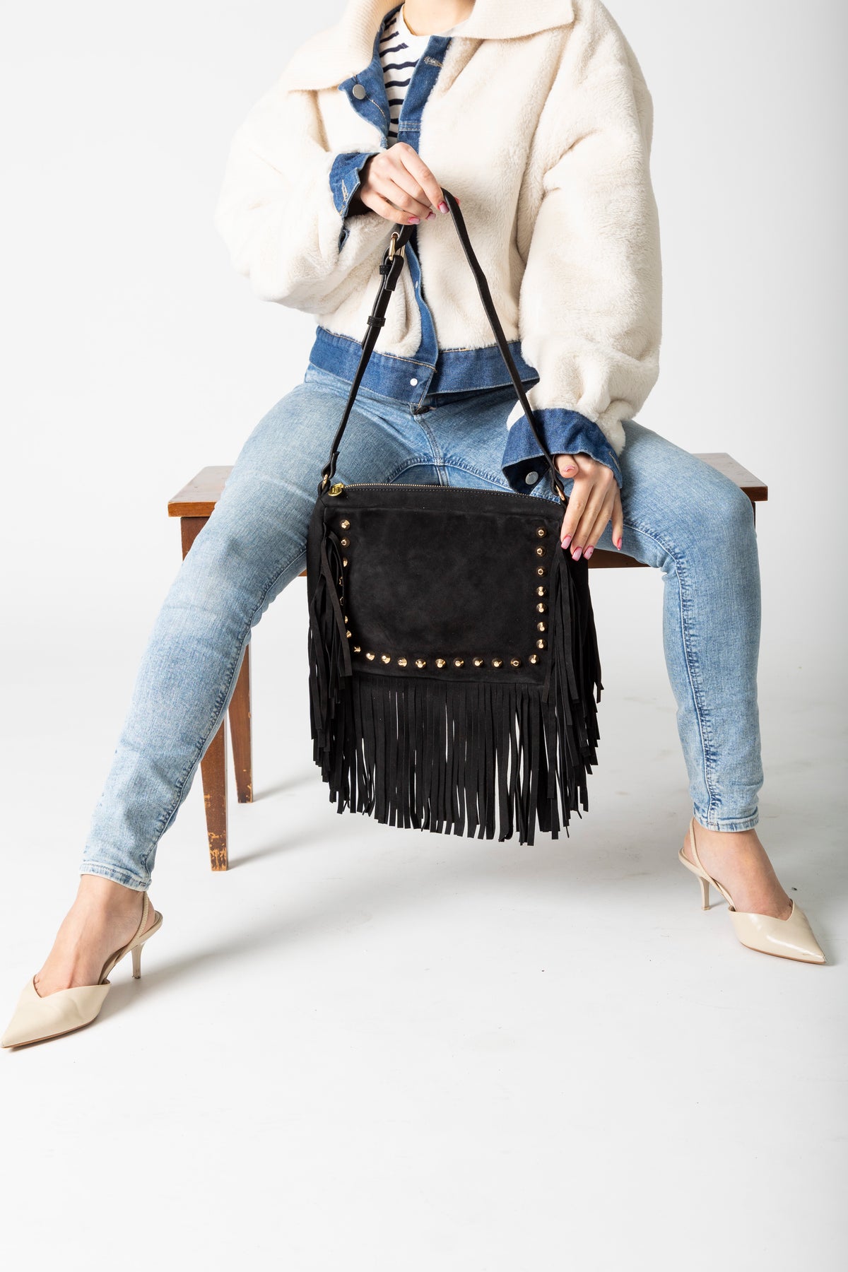 Step out with confidence and flair with our Fringed Bag, a statement piece designed for the fashion-forward. Featuring playful fringes and eye-catching gold studs, this bag channels a chic, boho vibe that effortlessly enhances any outfit.